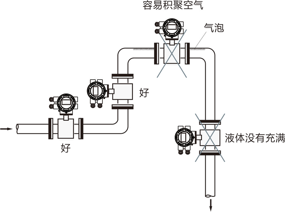 可以說,非滿管是含有氣泡的一種極端情況,既是管內(nèi)液體未滿,頂部又含有大量氣泡,如果液體還沒沒過電極,那測量結果就會大打折扣。這當屬工程設計之誤。
