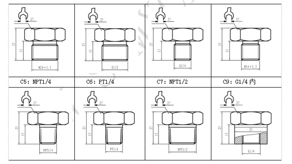 | 型號 | 量程(bar) | 精度 | 輸出信號 | 螺紋接口 | 電氣連接 | 其它要求 |