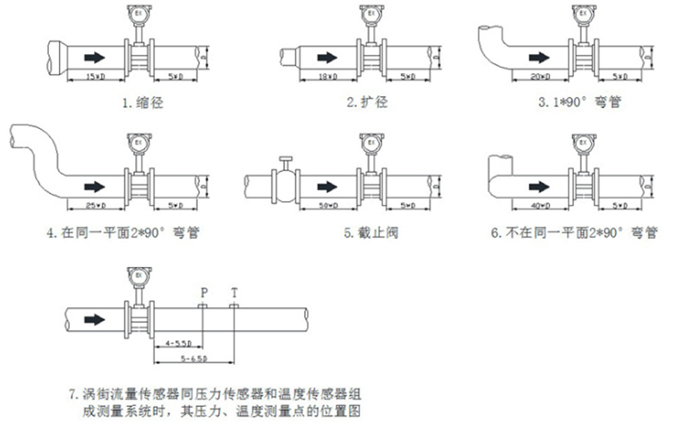 為了準確測量,流量計的上、下游必須留有足夠的直管段,上游不應有影響流體流速分布的部件