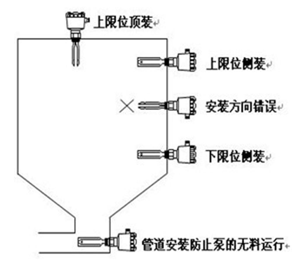 8、音叉限位開關(guān)通常采用側(cè)裝方式安裝與倉體側(cè)壁對料高度進行上下限位置檢測,當(dāng)倉體不便側(cè)面開孔時可采用頂裝,位置選擇能避開料位沖擊的位置。