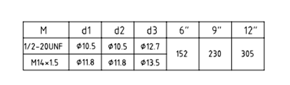 45°斜面密封 | D1 | M12×1.5 | M14×1.5 | 1/2-20UNF | M18×1.5 |