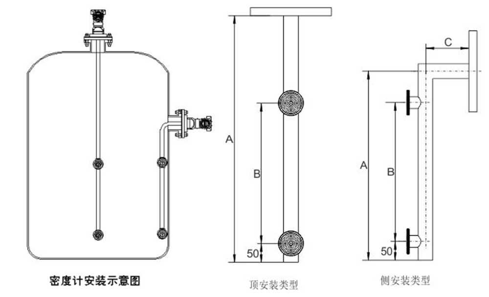 智能在線密度計(jì)在結(jié)構(gòu)上設(shè)計(jì)有三種類型,即頂安裝類型和側(cè)安裝類型,以及管道式安裝。頂安裝類型適用于罐體安裝,側(cè)安裝類型適用于管道安裝,以滿足不同工況下的密度測量需求